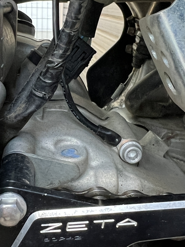次にクランクケース側のボルトを“アーシングボルト”に入れ替え、キット付属の“アーシングケーブル”を固定します。(右側がノーマル)