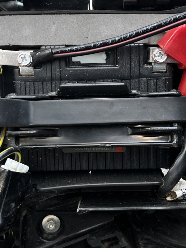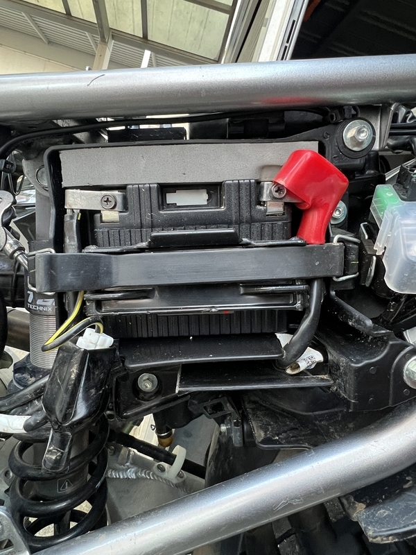 最後にバッテリーのターミナルボルトを入れ替え、“−(マイナス)側”の銅ワッシャーの下側に“アーシングケーブル”を固定します。(上側がノーマル)